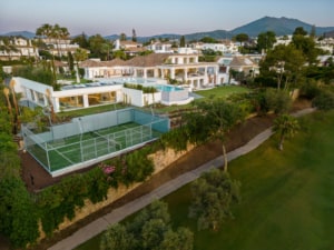En tête de notre classement, la Villa Ninamu est sans aucun doute l’une des meilleures villas de luxe à Marbella. Située à Nueva Andalucía, cette villa de 7 chambres et 9 salles de bains s’étend sur un terrain de 4000 m², offrant une vue imprenable sur la mer et le golf. La villa allie à la perfection le style andalou traditionnel et des touches modernes, créant un cadre de vie harmonieux et raffiné.